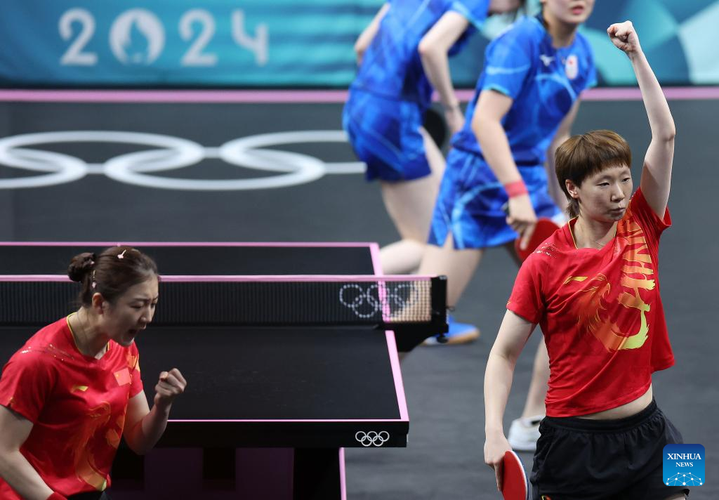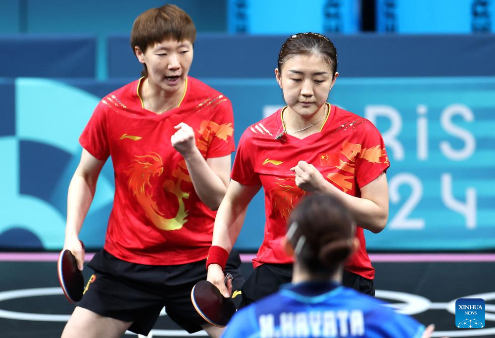 Chen Meng (L)/Wang Manyu of China react while competing against Hayata Hina/Harimoto Miwa of Japan during the women's team gold medal match of table tennis between China and Japan at the Paris 2024 Olympic Games in Paris, France, on Aug. 10, 2024. (Xinhua/Liu Xu)