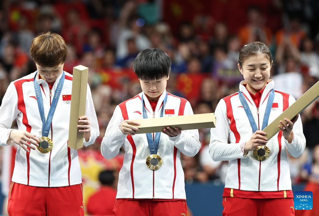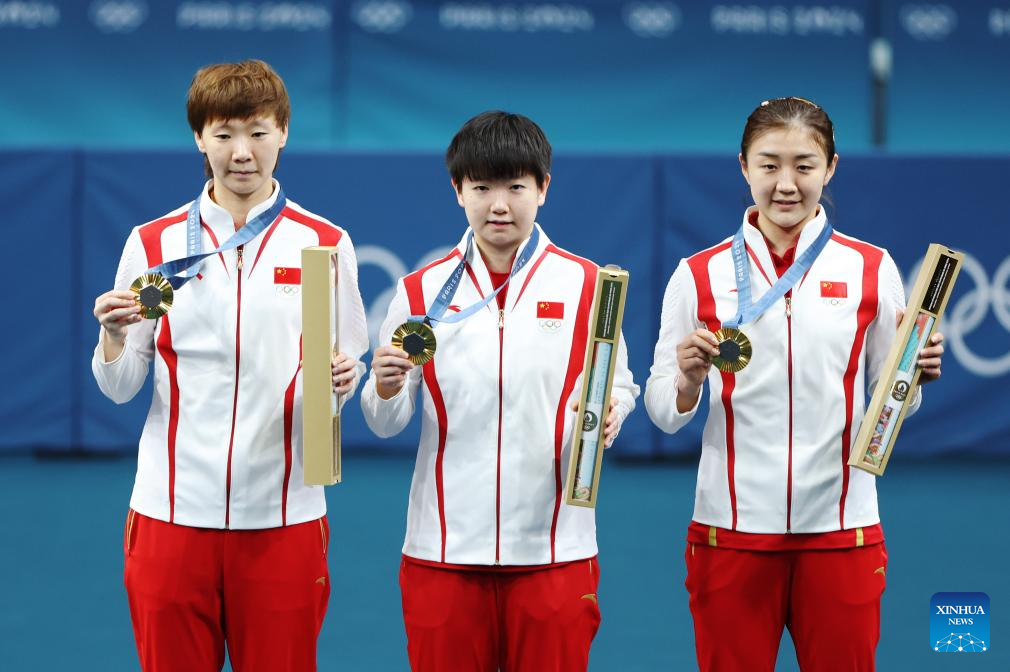 Gold medalists of team China pose during the victory ceremony for women's team of table tennis at the Paris 2024 Olympic Games in Paris, France, on Aug. 10, 2024. (Xinhua/Liu Xu)