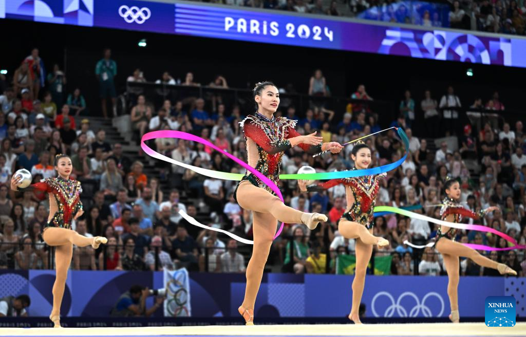 Athletes of Team China compete during the group all-round final of rhythmic gymnastics at the Paris 2024 Olympic Games in Paris, France, Aug. 10, 2024. (Xinhua/Cheng Min)
