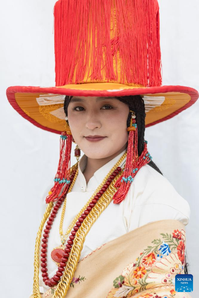 A woman presents Tibetan costumes during a fashion show held at the opening ceremony of a nomadic cultural tourism season in Sertar County, southwest China's Sichuan Province, Aug. 10, 2024. (Xinhua/Jiang Hongjing)