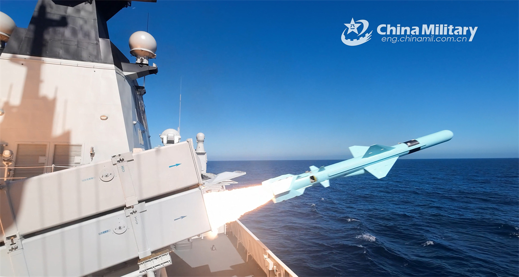 A warship attached to a naval frigate flotilla under the PLA Eastern Theater Command fires missile at mock targets during a multi-subject training exercise on July 4, 2024. (eng.chinamil.com.cn/Photo by Liu Jia)