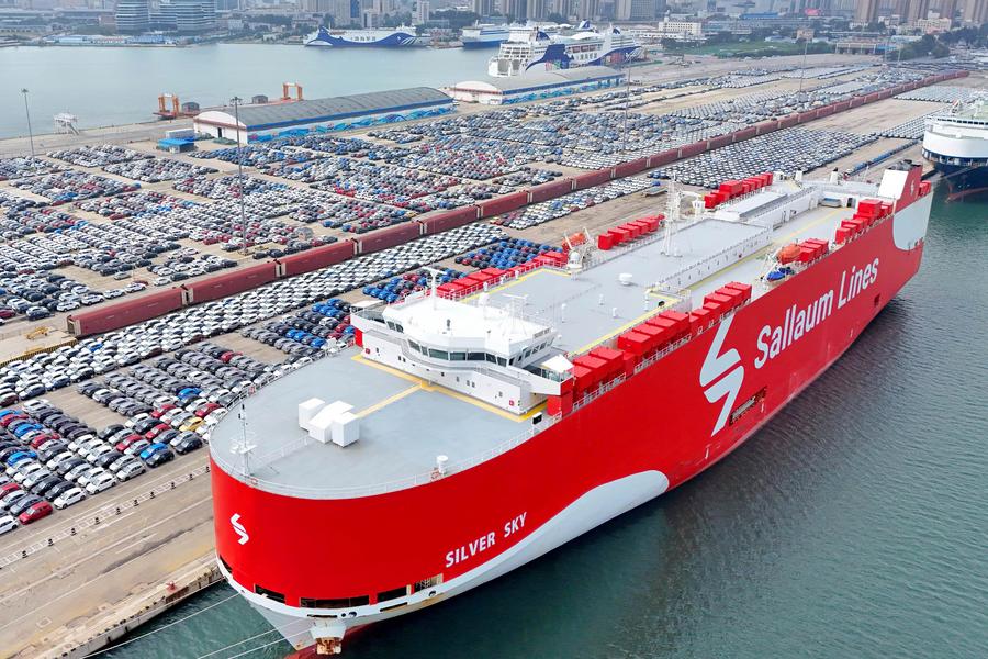 An aerial drone photo taken on Aug. 6, 2024 shows commercial vehicles to be exported beside a ro-ro ship at Yantai Port in east China's Shandong Province. (Photo by Tang Ke/Xinhua)