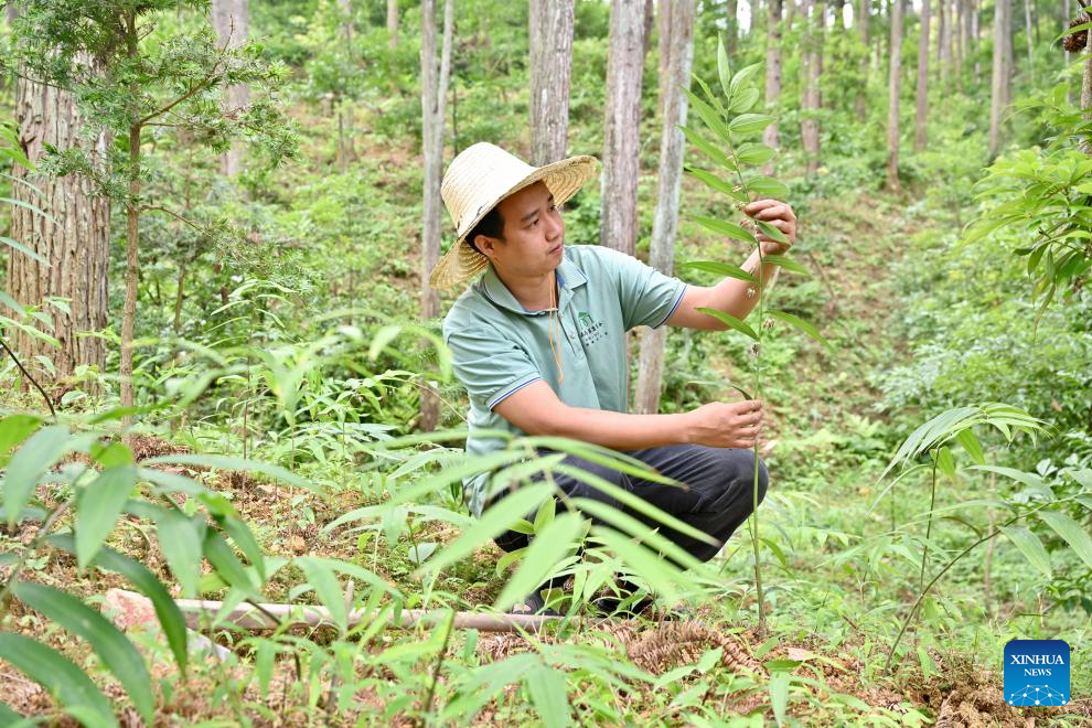 A staff member checks growth of plants at a planting demonstration base for Chinese medicinal herbs in Sanming City, southeast China's Fujian Province, May 9, 2024. Sanming City has been exploring a new path of development that embraces green transformation to boost rural tourism including forest-based health services and other economic activities. Currently, forests cover 77.12 percent of the total area in the city. (Xinhua/Jiang Kehong)