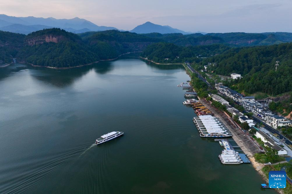 An aerial drone photo shows a view of Dajinhu scenic area of Taining County, Sanming City, southeast China's Fujian Province, Aug. 10, 2024. Sanming City has been exploring a new path of development that embraces green transformation to boost rural tourism including forest-based health services and other economic activities. Currently, forests cover 77.12 percent of the total area in the city. (Xinhua/Jiang Kehong)