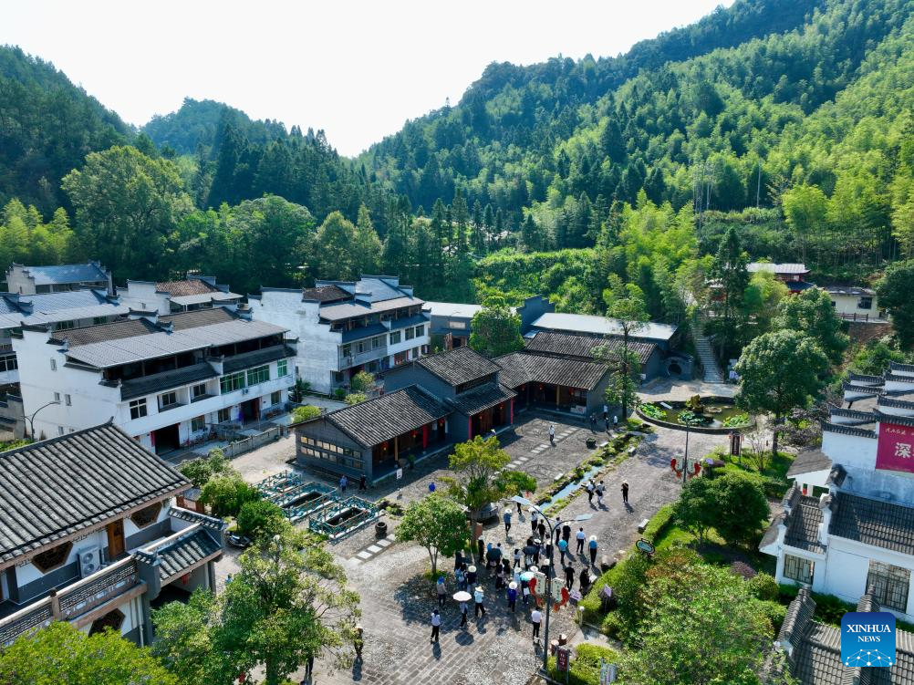 An aerial drone photo shows people visiting Chongji Village of Taining County, Sanming City, southeast China's Fujian Province, Aug. 11, 2024. Sanming City has been exploring a new path of development that embraces green transformation to boost rural tourism including forest-based health services and other economic activities. Currently, forests cover 77.12 percent of the total area in the city. (Xinhua/Jiang Kehong)