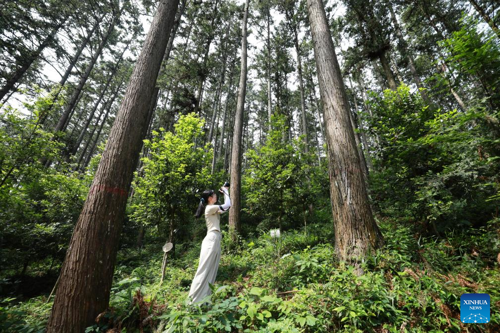A woman takes photos at a forest farm in Shaxian County, Sanming City, southeast China's Fujian Province, Aug. 10, 2024. Sanming City has been exploring a new path of development that embraces green transformation to boost rural tourism including forest-based health services and other economic activities. Currently, forests cover 77.12 percent of the total area in the city. (Xinhua/Jiang Kehong)