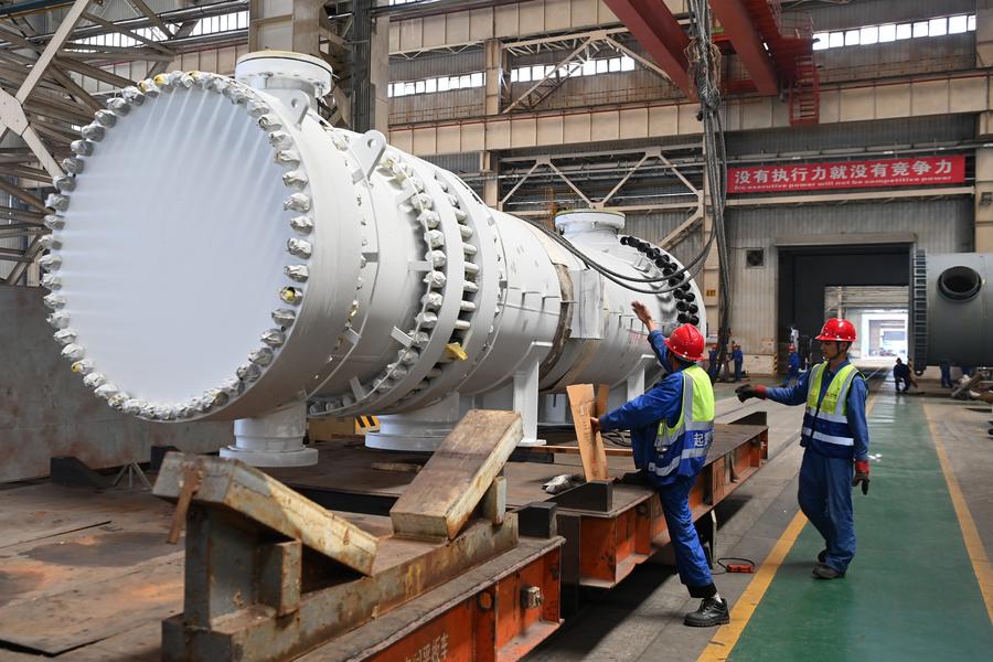 Workers hoist a storage tank at an industrial park of Lanzhou LS Group in Lanzhou New Area, northwest China's Gansu Province, July 25, 2024. (Xinhua/Fan Peishen)