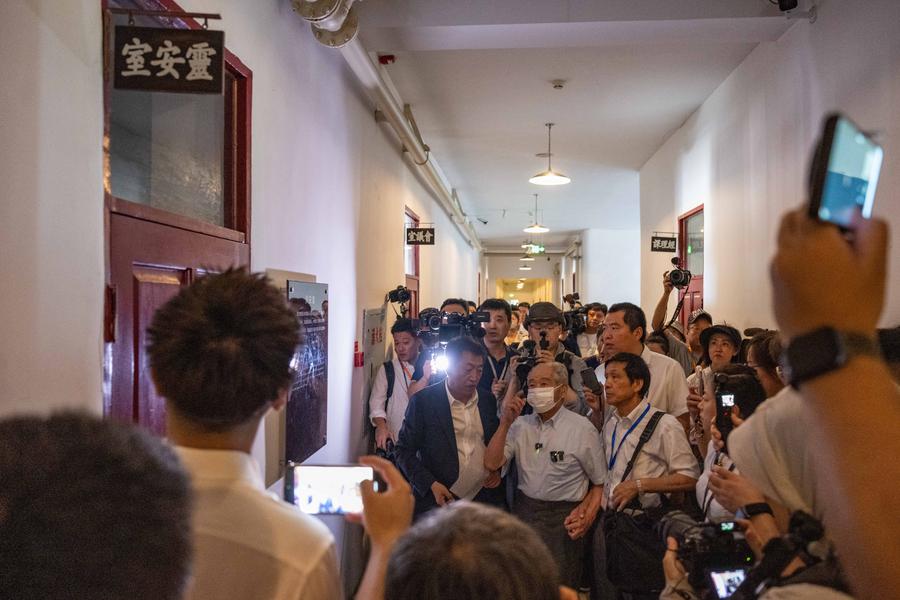 Hideo Shimizu (2nd L, front) puts his palms together as he identifies the crimes of the Japanese germ-warfare at the former site of Unit 731 in Harbin, northeast China's Heilongjiang Province, Aug. 13, 2024. (Xinhua/Xie Jianfei)
