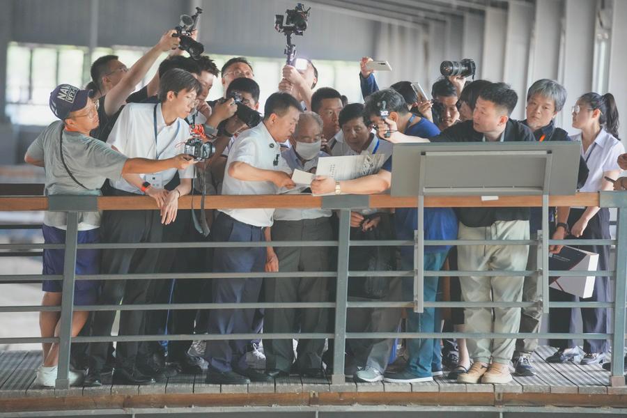 Hideo Shimizu (2nd R, front) identifies the crimes of the Japanese germ-warfare at the former site of Unit 731 in Harbin, northeast China's Heilongjiang Province, Aug. 13, 2024. (Xinhua/Xie Jianfei)