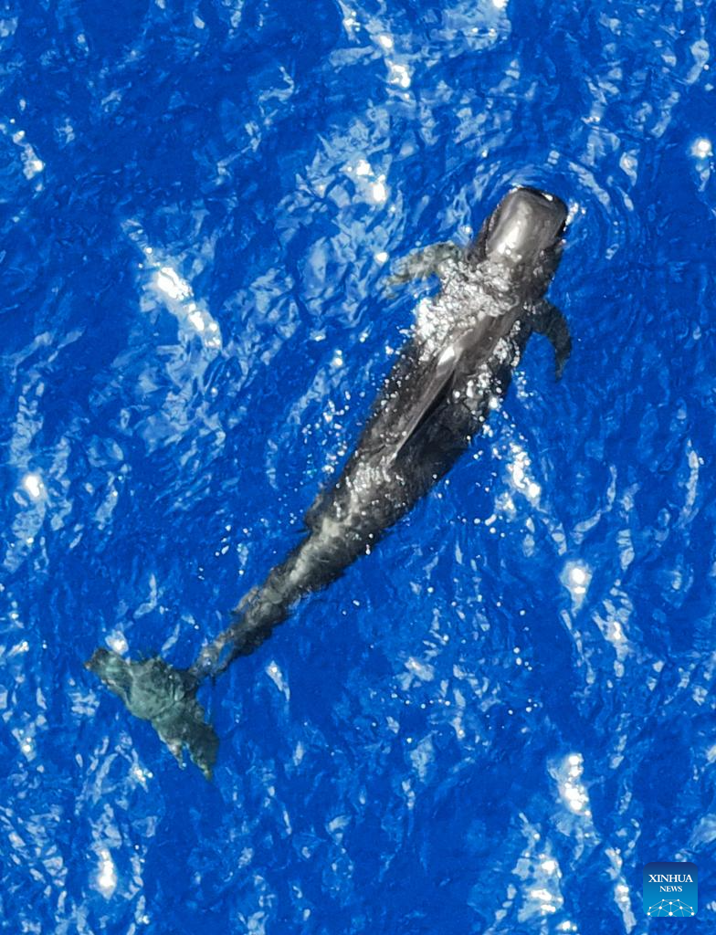 An aerial drone photo taken on June 30, 2024 shows a short-finned pilot whale swimming in the South China Sea.