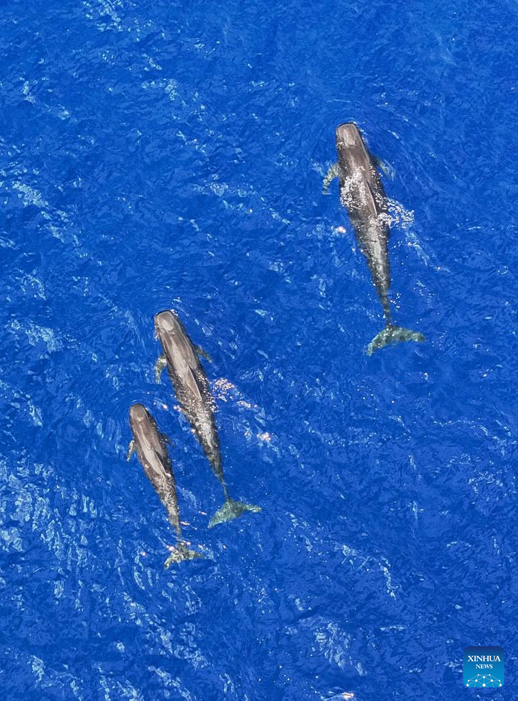 An aerial drone photo taken on June 30, 2024 shows short-finned pilot whales swimming in the South China Sea.