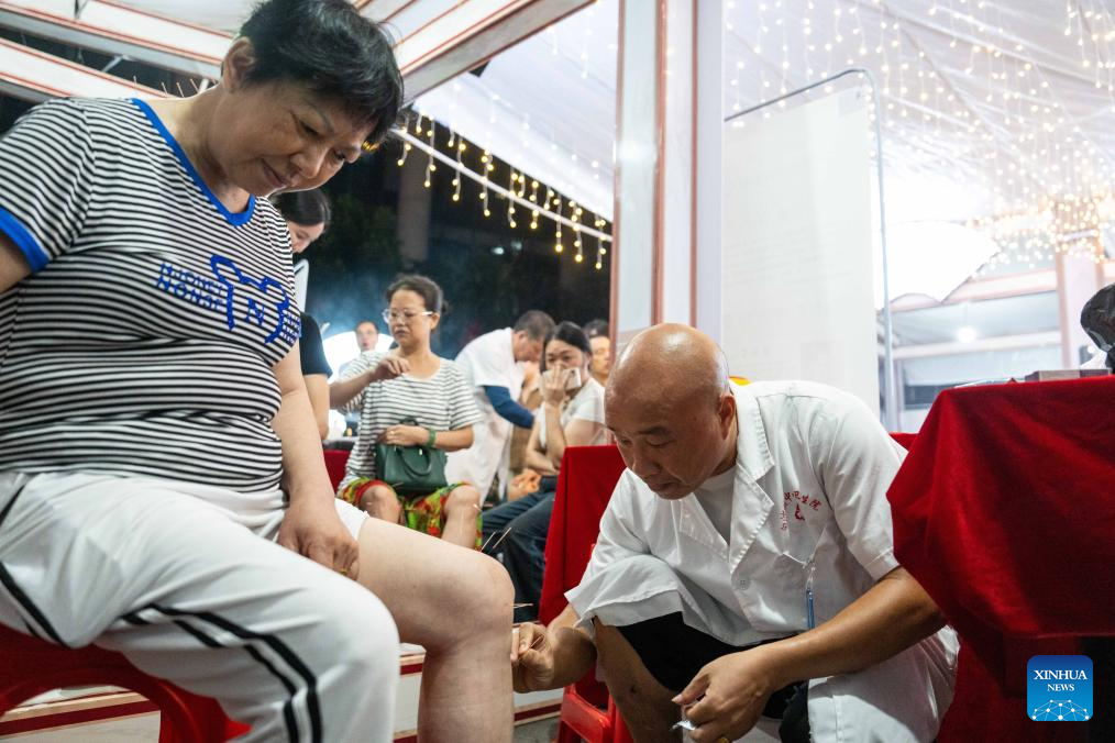 A citizen receives treatment at a night traditional Chinese medicine clinic in Changning City, central China's Hunan Province, Aug. 13, 2024.?(Xinhua/Chen Sihan)