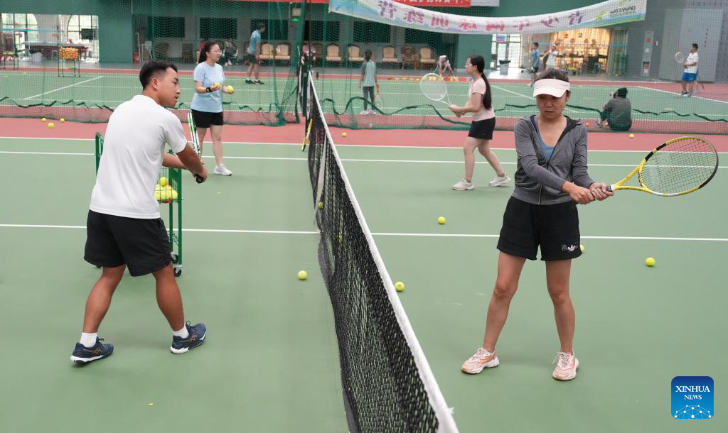 Adult students participate in a tennis class at a tennis club in Beijing, China, Aug. 14, 2024. (Xinhua/Cai Yang)
