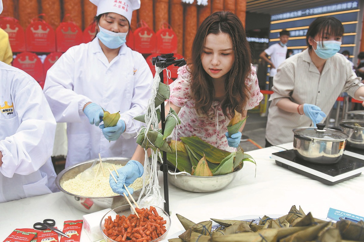 A college student learns how to make latiao dumplings on June 11, 2021, for the Dragon Boat Festival. (YANG HUAFENG/CHINA NEWS SERVICE)