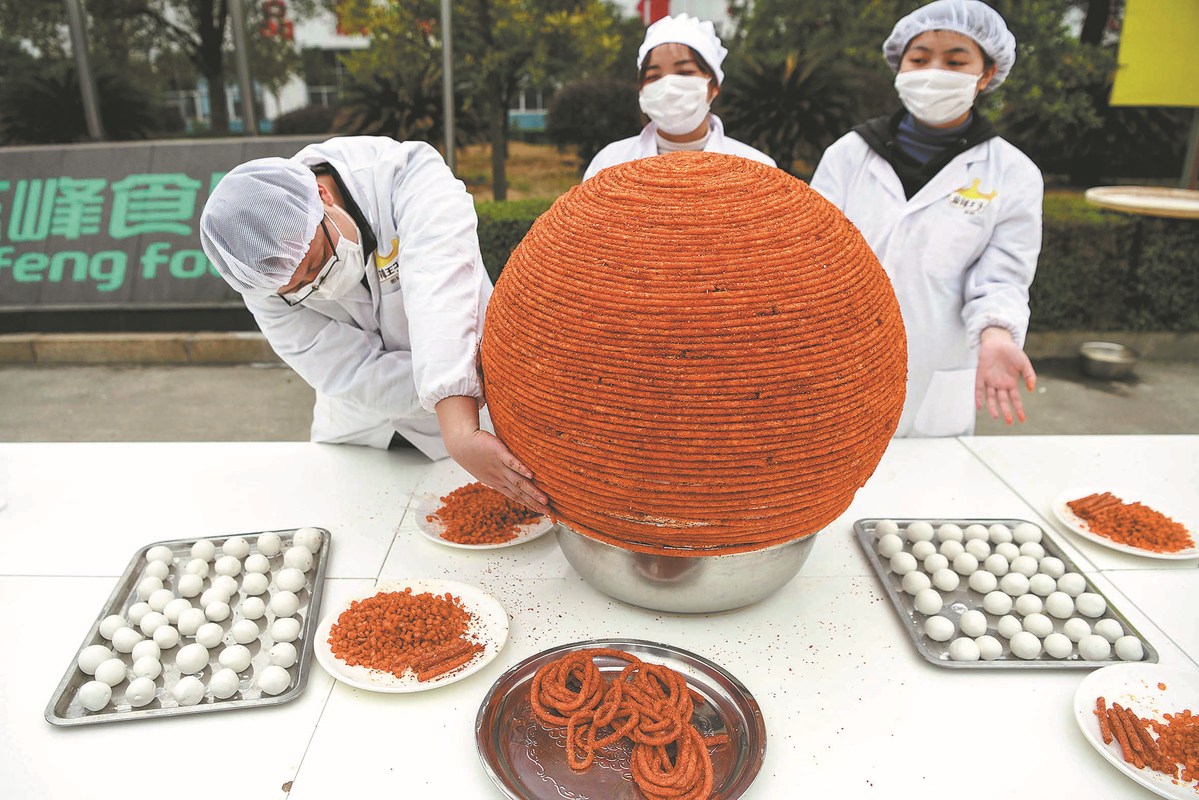 Workers use latiao to make a giant tangyuan on Feb 24, 2021, to celebrate the Lantern Festival, in Pingjiang county. (YANG HUAFENG/CHINA NEWS SERVICE)