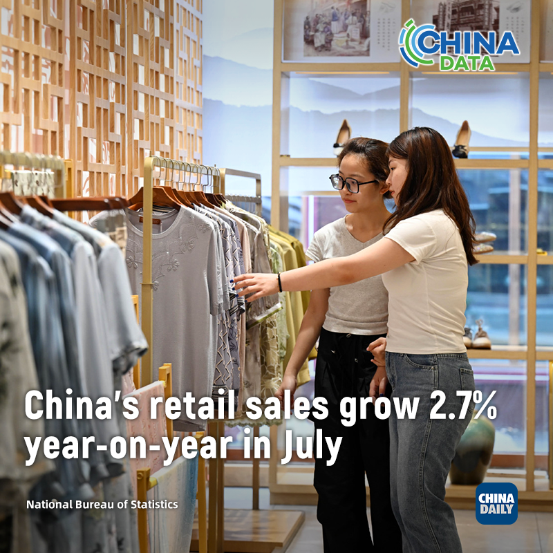 Figures released on Thursday by the National Bureau of Statistics showed China's retail sales, a key measurement of consumer spending, grew by 2.7 percent year-on-year in July, up from the 2 percent growth in June.