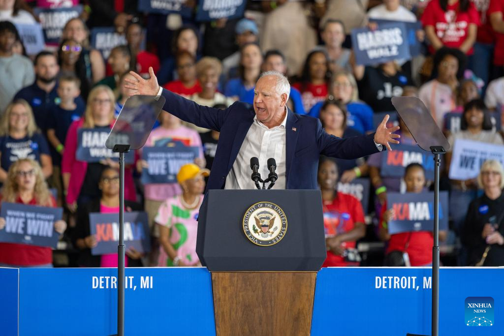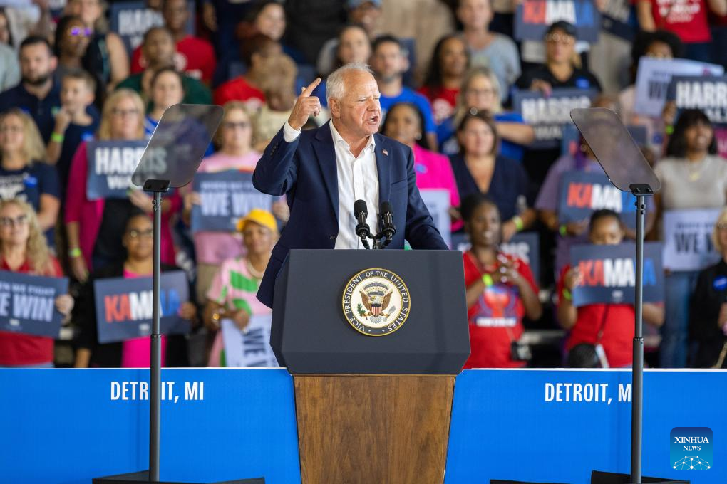 File photo taken on Aug. 7, 2024 shows Tim Walz speaking during a campaign rally at an airport hangar outside Detroit, Michigan, the United States. U.S. Vice Presidential nominees - Minnesota Governor Tim Walz and Ohio Senator J.D. Vance - on Thursday agreed to participate in a debate hosted by CBS News, which is scheduled for Oct. 1. (Xinhua/Hu Yousong)