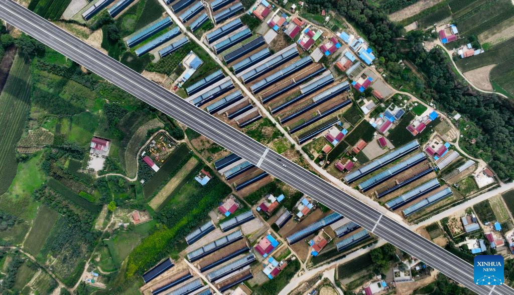 This aerial drone photo taken on Aug. 16, 2024 shows a vehicle running along the Yinchuan-Kunming highway with the Pengyang County in the background in northwest China's Ningxia Hui Autonomous Region. A section of the Yinchuan-Kunming highway within Ningxia, from Taiyangshan development zone to Pengyang, was completed and opened to traffic on Friday, marking the full opening of the Yinchuan-Kunming highway.