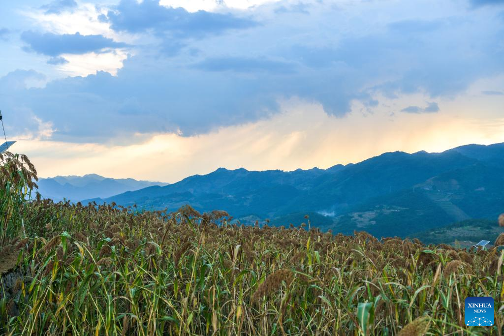 A farmer shows newly harvested sorghum at Yantou Village of Changgang Town, Huairen City of southwest China's Guizhou Province, Aug. 16, 2024. Covering an area of 24,000 hectares, the sorghum fields in Huairen has successively entered its harvest season recently. (Xinhua/Yang Wenbin)
