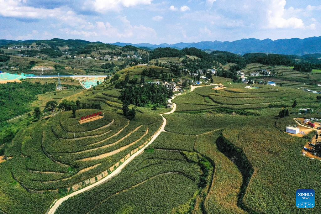 A drone photo shows a sorghum field at Maopo Village of Changgang Town, Huairen City of southwest China's Guizhou Province, Aug. 15, 2024. Covering an area of 24,000 hectares, the sorghum fields in Huairen has successively entered its harvest season recently. (Xinhua/Yang Wenbin)