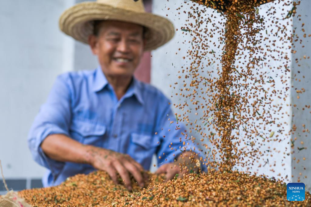 A farmer dries sorghum grains at Maopo Village of Changgang Town, Huairen City of southwest China's Guizhou Province, Aug. 15, 2024. Covering an area of 24,000 hectares, the sorghum fields in Huairen has successively entered its harvest season recently. (Xinhua/Yang Wenbin)