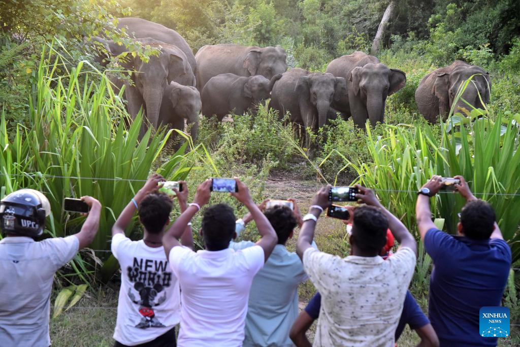 People take photos of wild elephants at a wildlife reserve in Galgamuwa, Sri Lanka, Aug. 15, 2024. (Photo by Gayan Sameera/Xinhua)