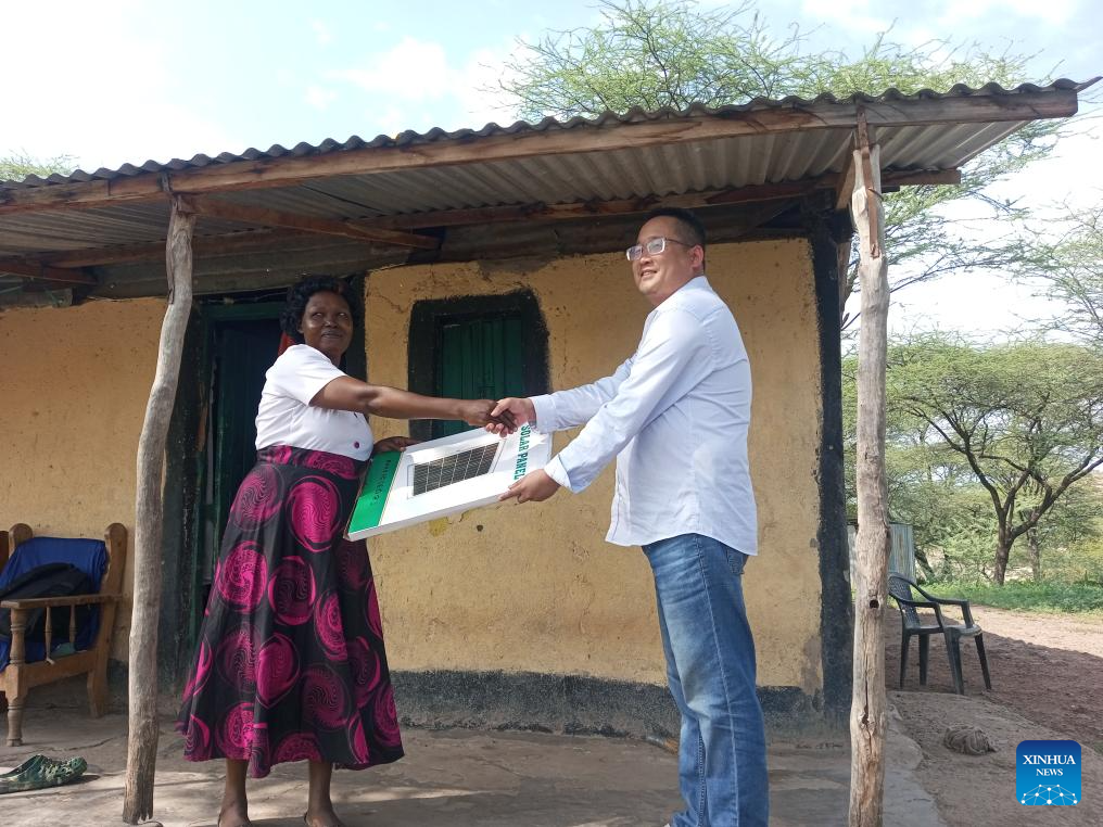 Doris Loruk Chepalat receives a solar panel kit from Han Ke, general manager of China's Chuanshan International Mining Company, in Kenya's northwest Baringo County, Aug. 15, 2024.(Photo by Ronald Njoroge/Xinhua)