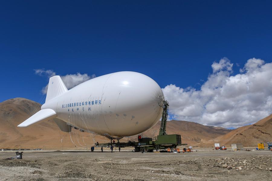 This photo taken on May 12, 2022 shows floating airship "Jimu No.1" type III in Zhaxizom Township of Tingri County, southwest China's Xizang Autonomous Region. (Xinhua/Jiang Fan)
