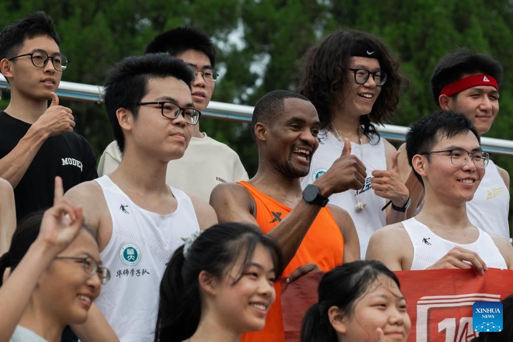 Lugazo Abubakar Lugazo (C) poses for a group photo after a running race in Wuhan, central China's Hubei Province, May 19, 2024.(Xinhua/Hu Jingwen)
