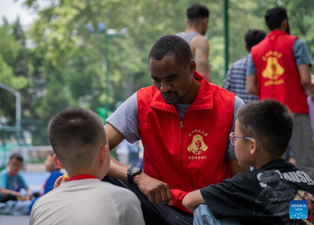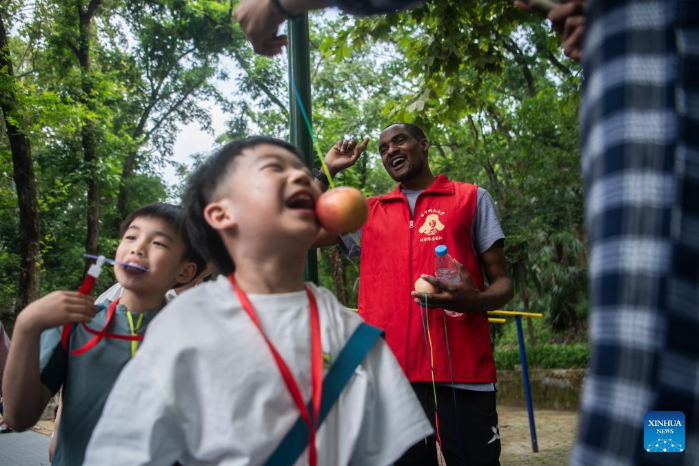 Lugazo Abubakar Lugazo (rear) interacts with children during a voluntary activity in Wuhan, central China's Hubei Province, May 19, 2024.(Xinhua/Wu Zhizun)