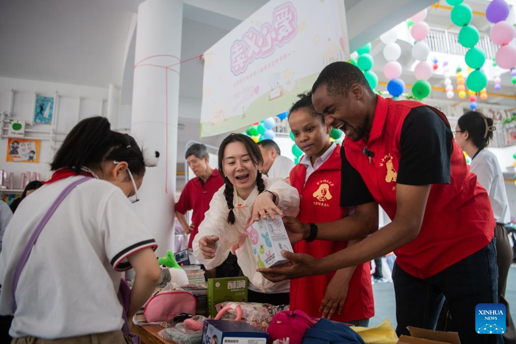 Lugazo Abubakar Lugazo (1st R) joins a charity bazaar in Wuhan, central China's Hubei Province, May 31, 2024.(Xinhua/Wu Zhizun)