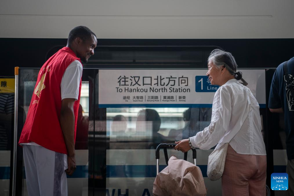 Lugazo Abubakar Lugazo (L) provides help for a passenger at a metro station in Wuhan, central China's Hubei Province, Aug. 18, 2024. (Xinhua/Wu Zhizun)