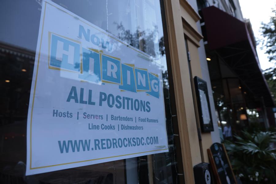 A hiring sign is posted on the window of a restaurant in the Old Town neighborhood of Alexandria, Virginia, the United States, on Aug. 18, 2022. (Photo by Ting Shen/Xinhua)