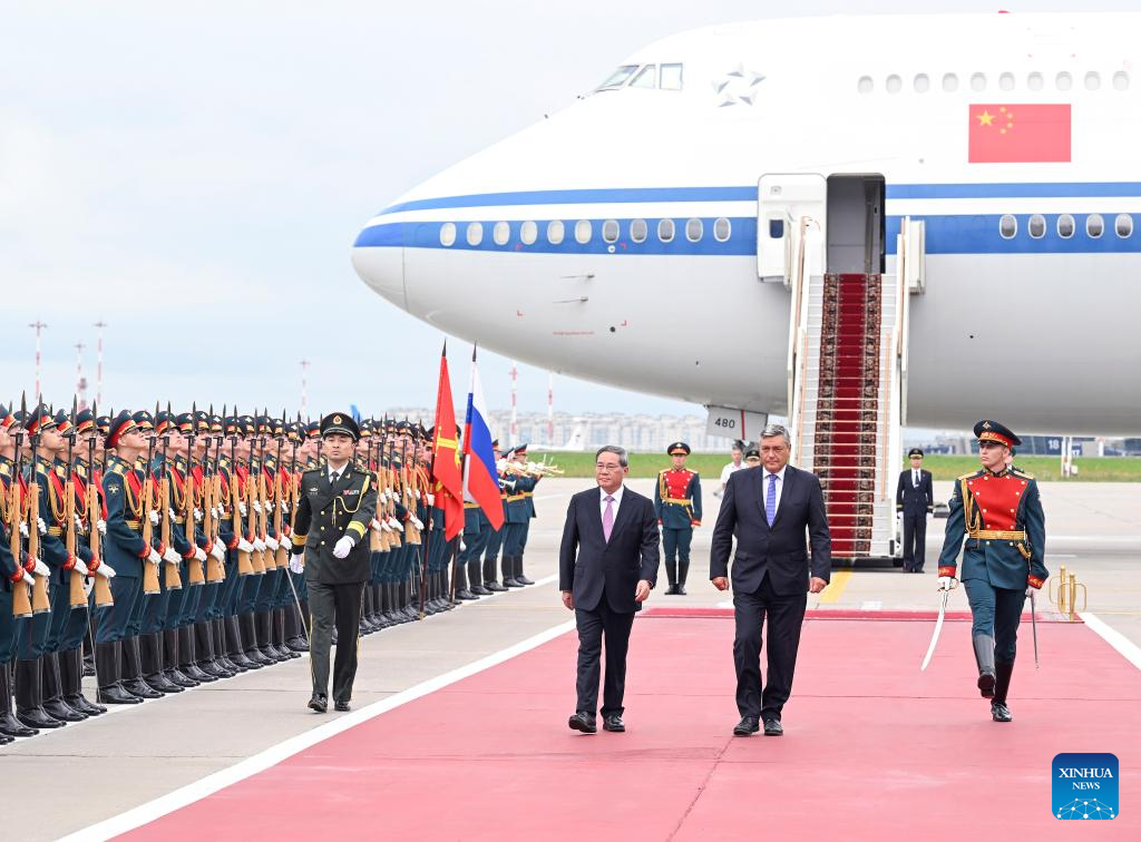 Chinese Premier Li Qiang, accompanied by senior Russian government officials, reviews the honor guard during a grand welcome ceremony at Vnukovo Airport in Moscow, Russia, Aug. 20, 2024. Li arrived here on Tuesday to hold the 29th regular meeting between Chinese and Russian heads of government and visit Russia at the invitation of Russian Prime Minister Mikhail Mishustin. (Xinhua/Rao Aimin)
