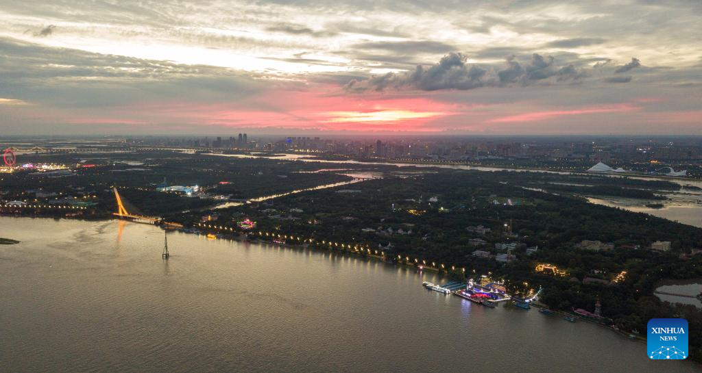 An aerial drone photo taken on June 10, 2024 shows the night view of the Harbin section of the Songhua River in Harbin, northeast China's Heilongjiang Province. Known as China's "Ice City", Harbin has a reputation for its cool weather and diversified attractions, even during the summer months, which helps it remain attractive to tourists throughout the year. (Xinhua/Xie Jianfei)