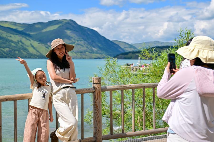 Tourists pose for photos in the Kanas scenic area of Altay, northwest China's Xinjiang Uygur Autonomous Region, July 22, 2024. (Xinhua/Ding Lei)