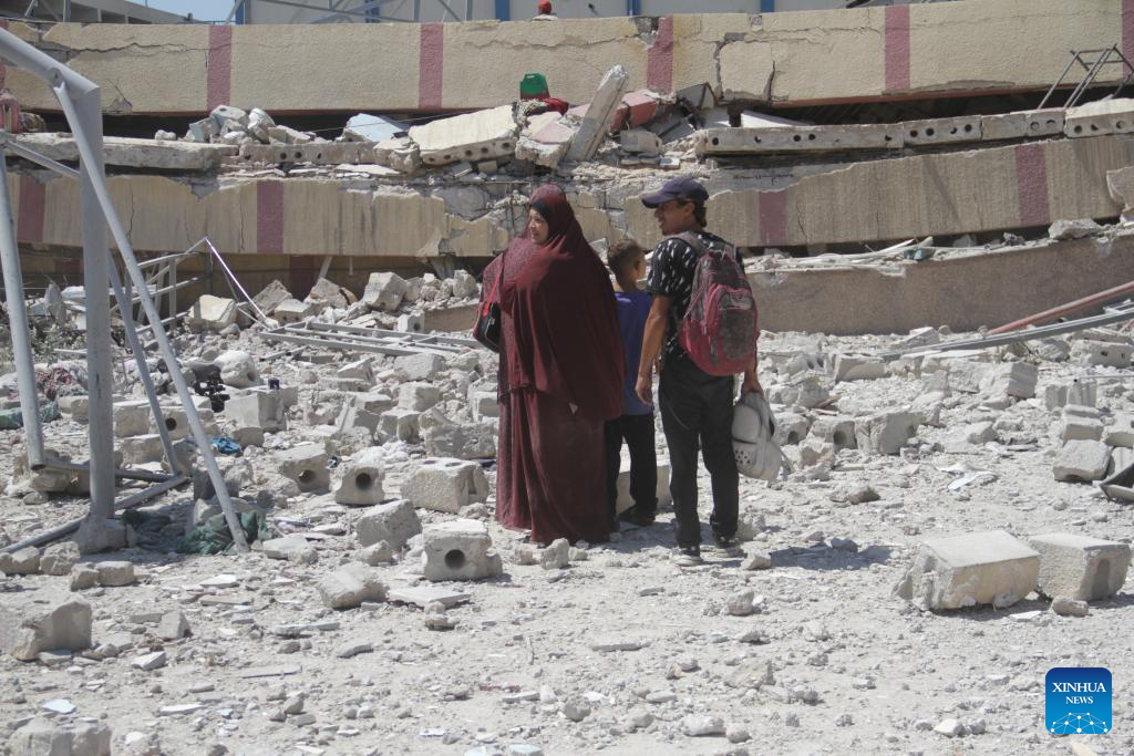 People stand in front of a school building destroyed in an Israeli airstrike at the al-Rimal neighborhood in Gaza City, on Aug. 20, 2024. At least nine Palestinians were killed, and others were wounded in an Israeli airstrike on a school sheltering displaced people in Gaza City, Palestinian security and medical sources said Tuesday. (Photo by Mahmoud Zaki/Xinhua)