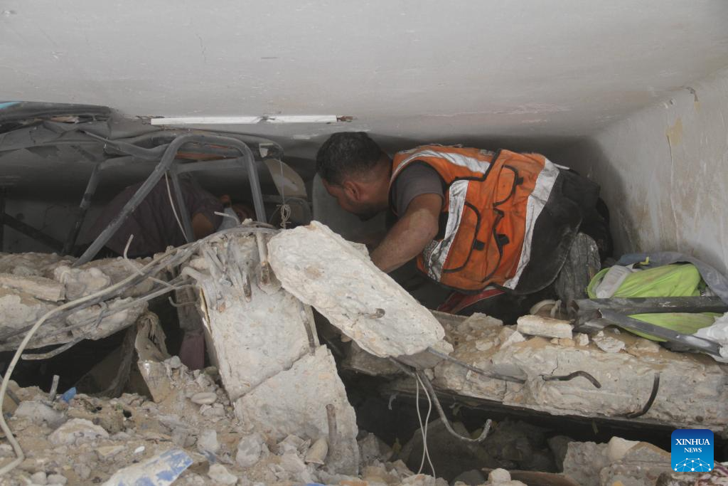 People search for victims among the rubble of a school building destroyed in an Israeli airstrike at the al-Rimal neighborhood in Gaza City, on Aug. 20, 2024. At least nine Palestinians were killed, and others were wounded in an Israeli airstrike on a school sheltering displaced people in Gaza City, Palestinian security and medical sources said Tuesday. (Photo by Mahmoud Zaki/Xinhua)