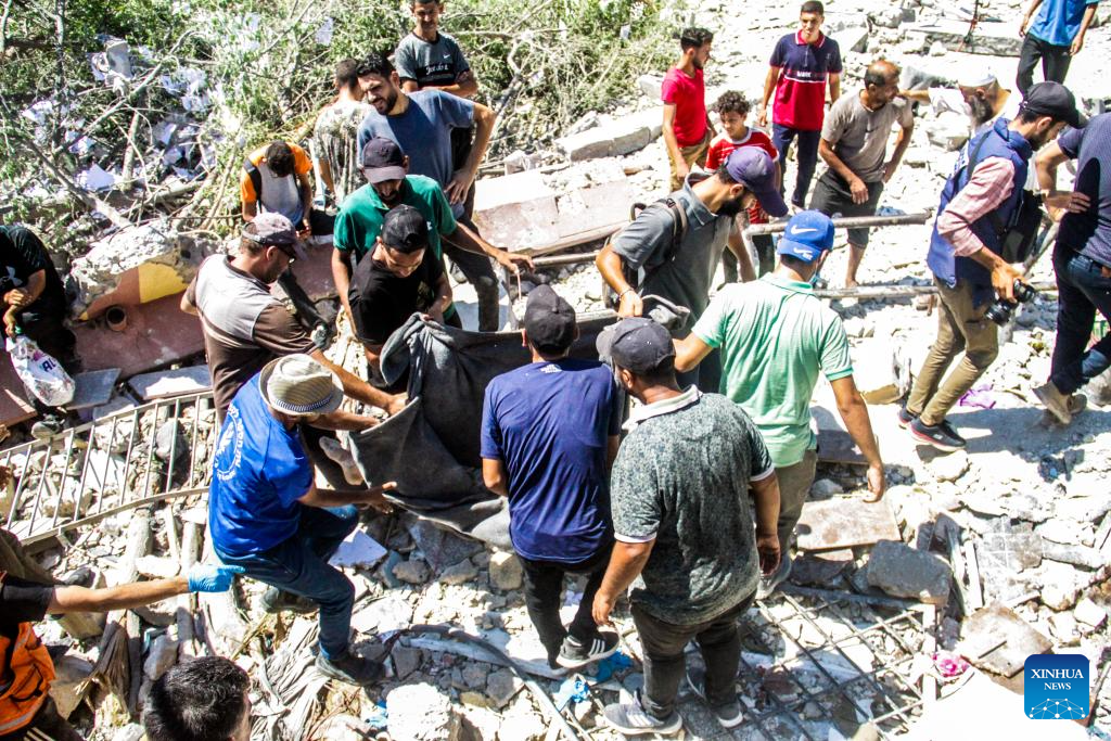 People remove a victim from a school building destroyed in an Israeli airstrike at the al-Rimal neighborhood in Gaza City, on Aug. 20, 2024. At least nine Palestinians were killed, and others were wounded in an Israeli airstrike on a school sheltering displaced people in Gaza City, Palestinian security and medical sources said Tuesday. (Photo by Mahmoud Zaki/Xinhua)