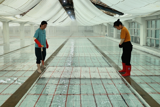 In the seedling room of Guanwu Marine Products Development Co., Ltd., located in Lianjiang county, workers were carefully placing kelp seedlings, tied with white ropes, into the seedling pool.