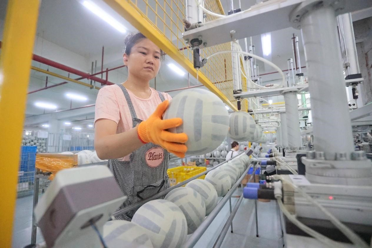A worker manufactures soccer bladders to be used during the Paris Olympics in a workshop of a sports equipment company in Huai'an, east China's Jiangsu province, July 18, 2024. (People's Daily Online/Wang Hao)