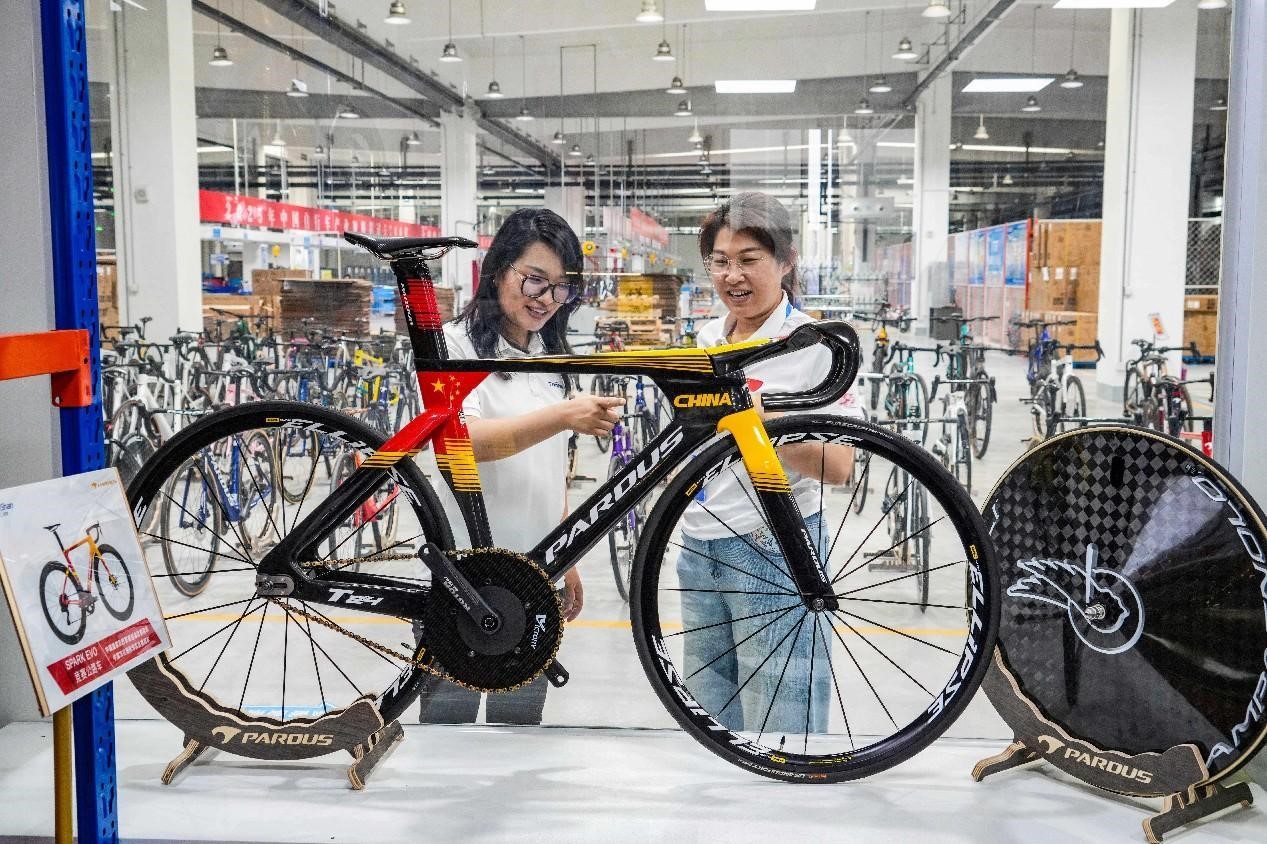 A sample of a bicycle to compete in the Paris Olympics is exhibited in a workshop of Shandong Taishan Ruibao Composite Material Co., Ltd. in east China's Shandong province, July 8, 2024. (People's Daily Online/Jia Peng)