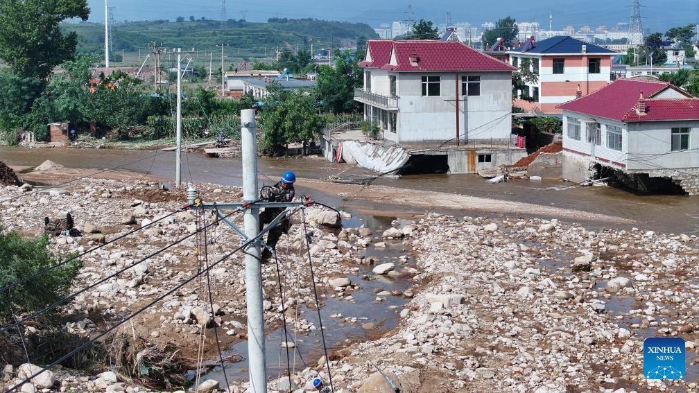 A worker repairs a power facility in Bailangshan Village of Jianchang County, Huludao City, northeast China's Liaoning Province, Aug. 22, 2024. The ongoing heavy rains have lashed the city of Huludao in Liaoning Province in recent days, causing severe damages to many townships. A joint emergency rescue team bearing relief materials has been dispatched by authorities to carry out rescue and relief work. (Xinhua)