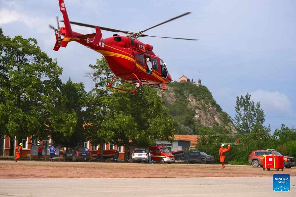 A helicopter transfers generators and relief supplies to a makeshift resettlement site in Heishanke Township, Jianchang County of Huludao City, northeast China's Liaoning Province, Aug. 22, 2024. The ongoing heavy rains have lashed the city of Huludao in Liaoning Province in recent days, causing severe damages to many townships. A joint emergency rescue team bearing relief materials has been dispatched by authorities to carry out rescue and relief work. (Xinhua)