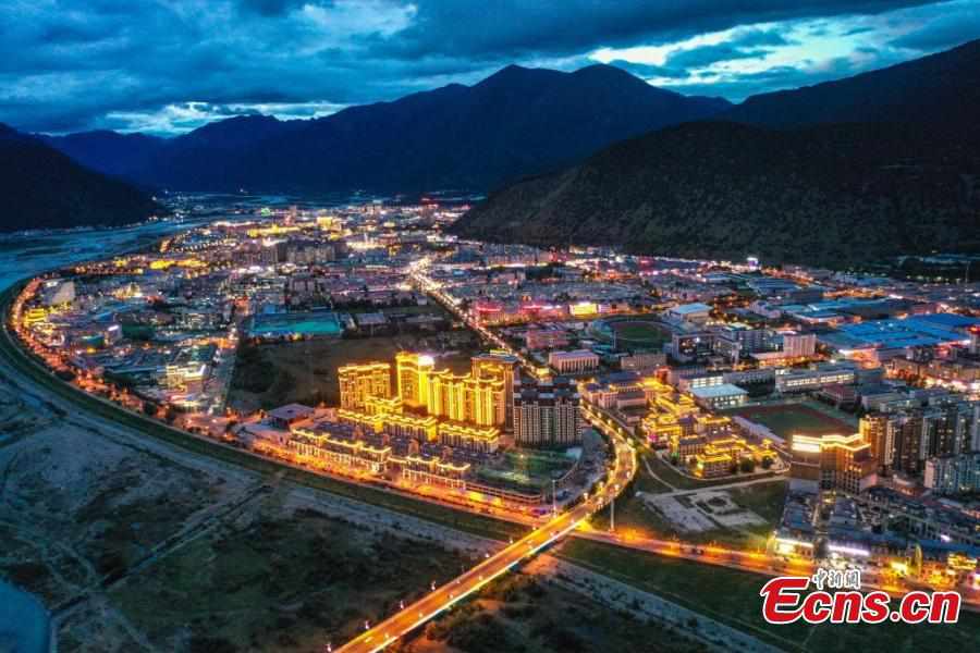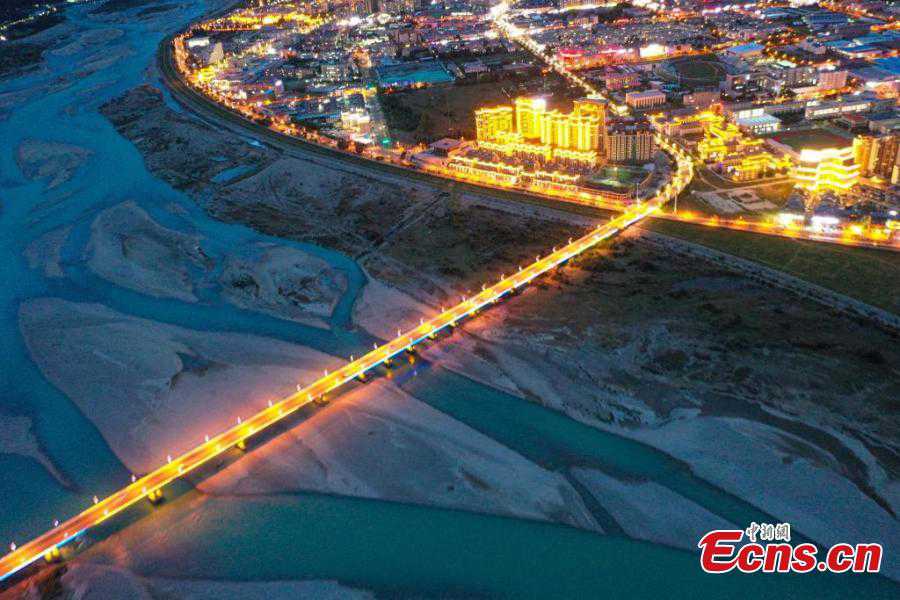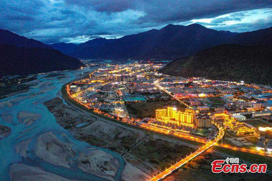 Lights illuminate Nyingchi City along the Nyang River, creating a picturesque night scenery in southwest China's Xizang Autonomous Region, Aug. 22, 2024. (Photo/China News Service)