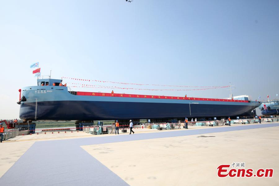 A new energy smart cargo ship, which will run along the Beijing-Hangzhou Grand Canal, is launched in Zoucheng, east China's Shandong Province, Aug. 22, 2024. (Photo: China News Service/Lv Weifeng)