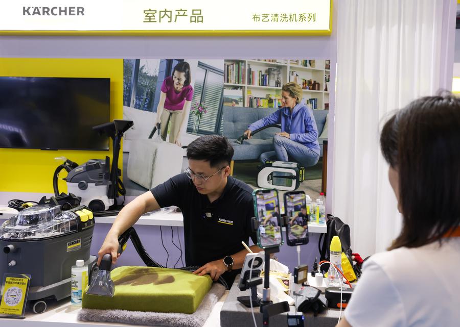 A staff member of German company Karcher displays a product at the fourth China International Consumer Products Expo (CICPE) in Haikou, south China's Hainan Province, April 14, 2024. (Xinhua/Yang Guanyu)