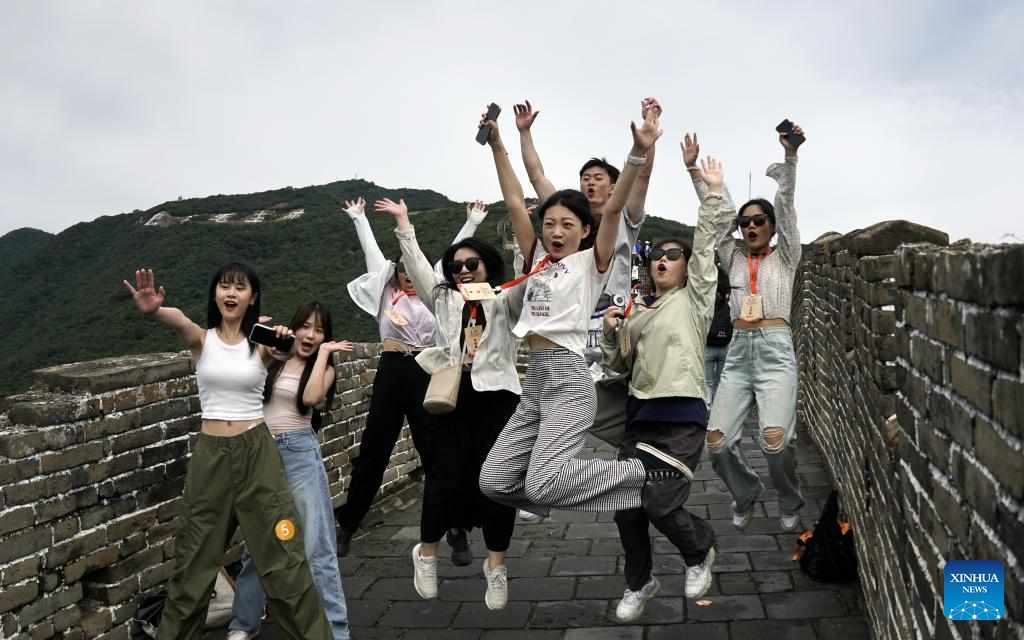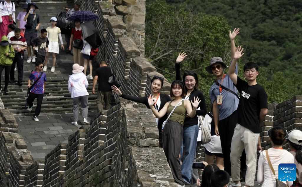 Participants of a cross-Strait journalism camp visit the Mutianyu section of the Great Wall in Beijing, capital of China, Aug. 25, 2024. (Xinhua/Li Xin)
