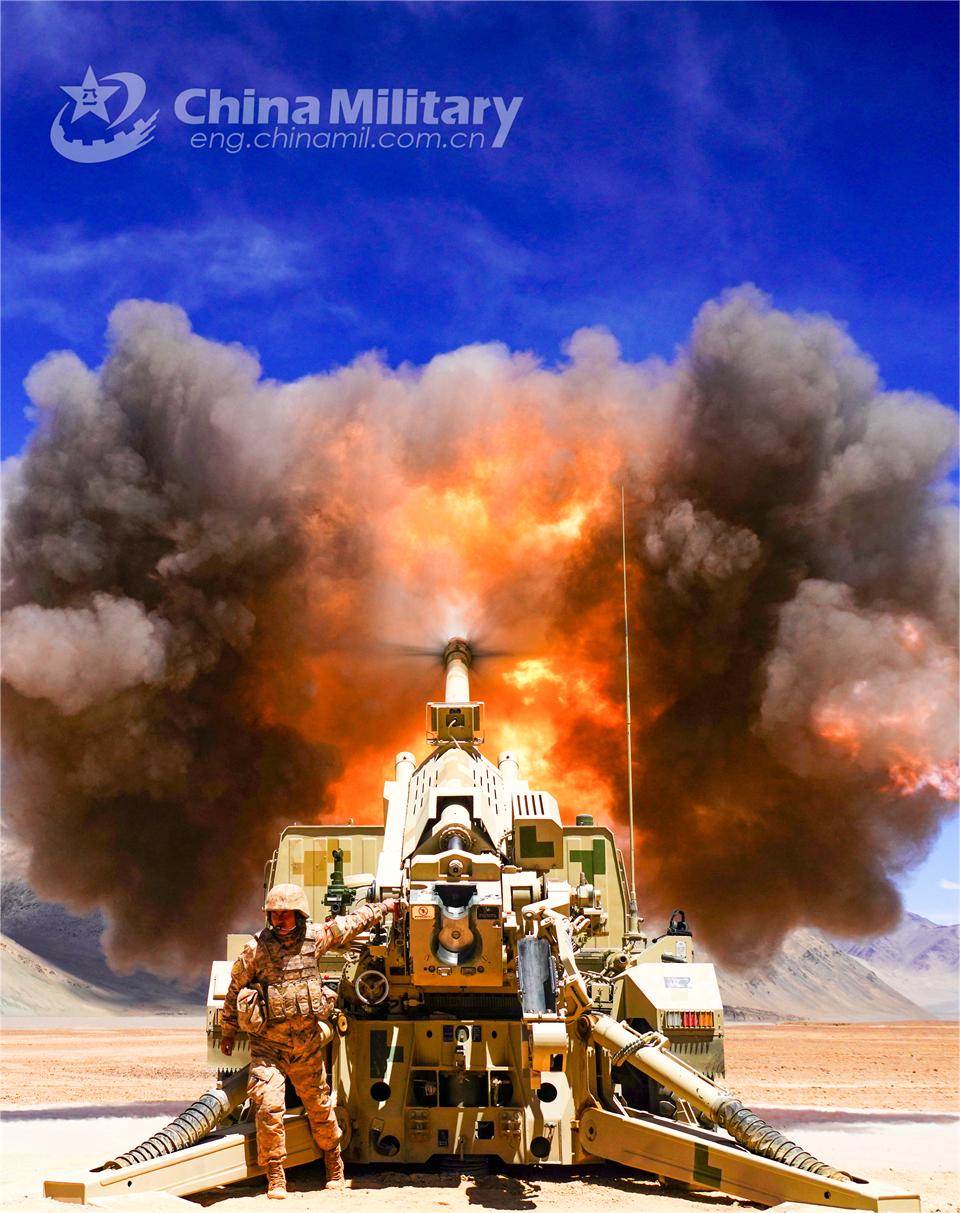 A vehicle-mounted 155mm truck-mounted howitzer attached to an artillery element of the PLA Army fires at mock targets during a live-fire training exercise on July 9, 2024. (eng.chinamil.com.cn/Photo by He Wenqi)
