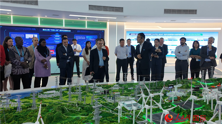 Foreign envoys and representatives of international organizations receive a presentation on the National Wind and Solar Energy Storage and Transmission Demonstration Project in front of a sand table model of the project. (People's Daily Online/Fang Tong)